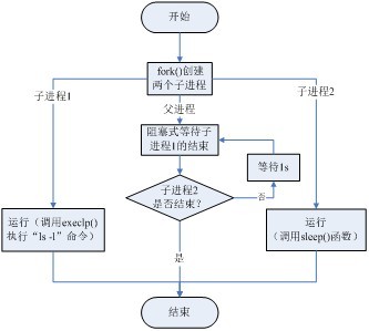 该实验有3个进程,其中一个为父进程,其余两个是该父进程创建的子进程,其中一个子进程运行“ls -l”指令,另一个子进程在暂停5s后异常退出。父进程先用阻塞方式等待第一个子进程的结束,然后用非阻塞方式等待另一个子进程的退出,待收集到第二个子进程结束的信息后,父进程就返回。